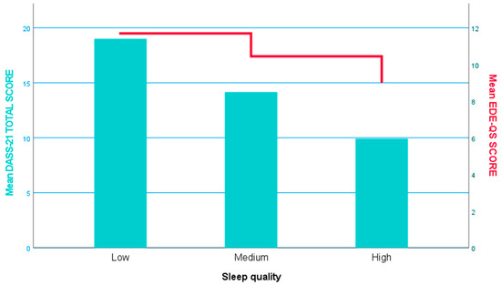 One-way ANOVA revealed a statistically significant (p < 0.05) difference in the means of both DASS-21 and EDE-QS scores in various sleep quality categories, with individuals with low sleep quality demonstrating higher DASS-21 and EDE-QS scores (Figure 1).