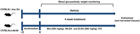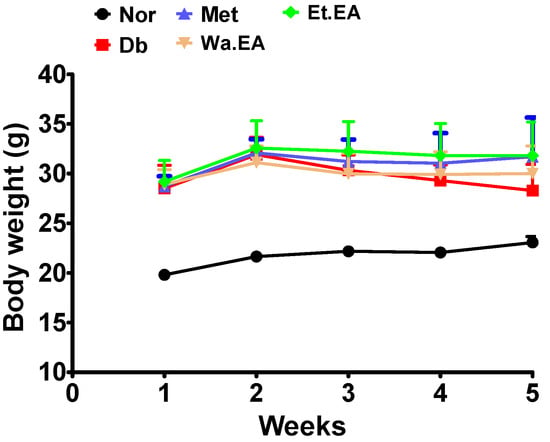 From the beginning of the study, we measured the body weight [23]. During the initial period of the study, there was an increase in the body weight of the C57BL/ksJ-db/db mice compared to the Nor group, but there was no difference between the drug-treated diabetes model groups (Figure 3). At the conclusion of the study, there was no difference in body weight changes between the pharmacological intervention (Met, Wa.EA, and Et.EA) and db groups.