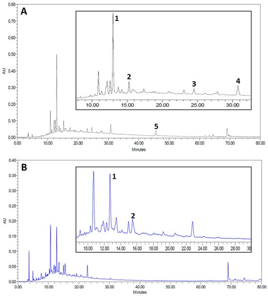 HPLC chromatogram of EA twig extract at 280 nm. (A) The 70% ethanol extract, showing identified constituents, namely catechin (peak 1), epicatechin (peak 2), taxifolin (peak 3), aromadendrin (peak 4), and naringenin (peak 5). (B) The water extract, possessing only catechin (peak 1) and epicatechin (peak 2) among the identified flavonoids.