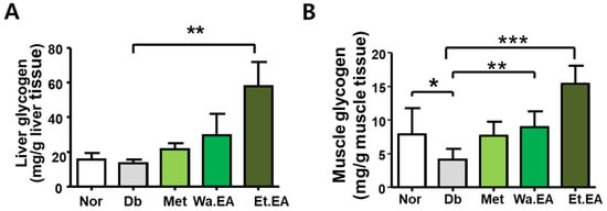 EA extract induces glycogen synthesis in Db mice. Nor: C57BL/6J Jms Slc mice treated with DW. Db: C57BL/6J Jms Slc mice treated with DW. Met: Db mice treated with 200 mg/kg/day of metformin. Wa.EA: Db mice treated with 500 mg/kg/day of water EA extract. Et.EA: Db mice treated with 500 mg/kg/day of 70% EtOH EA extract. (A) Liver and (B) muscle glycogen content for different groups of mice. The data are presented as the mean ± SD of three experiments (n = 10/group, * p < 0.05, ** p < 0.01, *** p < 0.001).