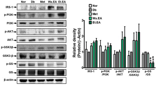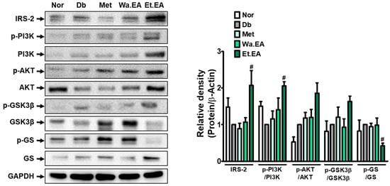 EtOH extract induces IRS-2/PI3K/AKT/GSK3β/GS expression in the liver of Db mice. Nor: C57BL/6J Jms Slc mice treated with DW. Db: C57BL/6J Jms Slc mice treated with DW. Metformin: Db mice treated with metformin. Wa.EA: Db mice treated with water EA extract. Et.EA: Db mice treated with 70% EtOH EA extract. The data are presented as the mean ± SD of triplicate samples. # p < 0.05 compared to the Db group of mice.