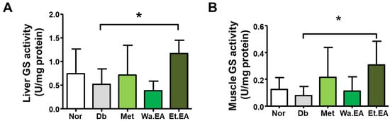 Insulin levels play a crucial role in regulating glycogen synthesis, which is essential for maintaining blood glucose levels. Glycogen synthase (GS) is the rate-limiting enzyme during glycogen synthesis [25,26]. As shown in Figure 7A, the activity of GS in the liver of the Db mice was observed to be less than in the Nor mice, indicating less glycogenesis. However, the lowered GS activity in the Db mice was significantly restored in the Et.EA-treated Db mice. In the Met-treated Db mice, the GS activity was less restored, while the Wa.EA-treated mice showed no changes. We observed that the muscles’ GS activity in the EA extract-treated Db mice showed a similar pattern as in the liver tissues (Figure 7B).