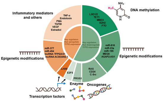 Key regulators modulating TFPI2 expression. Green and orange pie charts indicate key regulators that downregulate or upregulate TFPI2 expression, respectively.