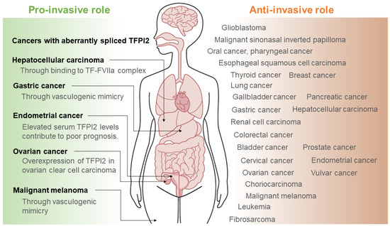 Thus, TFPI2 demonstrates anti-invasive properties in most cancers. Next, we will summarize some cancers where TFPI2 demonstrates a paradoxical dual role (i.e., pro-invasive and anti-invasive properties).