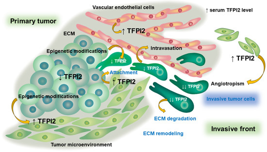 In general, the intravascular invasion of tumor cells is a crucial step in cancer metastasis [94]. Cancer cells invade surrounding tissues, effectively intravasate into vessel lumina, enter peripheral circulation, survive in the circulation, extravasate into target organs, seed distant organs, and eventually form metastases. However, it has been found that highly invasive cancer cells may not directly invade blood vessels but preferentially migrate along outside the vessel wall, supporting the formation of vasculature, disseminating to distant sites, and forming secondary tumors (Figure 2D) [11]. This process, known as angiotropism (i.e., vasculogenic mimicry or perivascular migration), involves the differential expression of key genes and pathways [11]. Enrichment analysis of differentially expressed genes identified TFPI2 as a potential biomarker for angiotropism [11]. Indeed, the downregulation of TFPI2 attenuated the perivascular migration of highly invasive melanoma cells [11]. Angiotropism is also observed in other cancers besides malignant melanoma [94]. Given that TFPI2 is downregulated in highly invasive cancer cells, it is plausible that TFPI2 is produced by cell populations distinct from cancer cells. For instance, TFPI2 protein is reported to be produced in vascular endothelial cells within the tumor microenvironment [95]. The coordinated upregulation of TFPI2 within the tumor microenvironment may play a significant role in angiotropism.