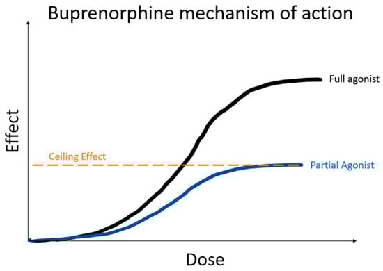 Opioid use disorder (OUD), a chronic neurobehavioral syndrome that causes a desire to misuse opioids despite the associated physical, emotional and social impairment, has caused a significant rise in opioid-related deaths within the last two decades []. Many individuals with OUD concurrently suffer from chronic pain. Issues attributed to undertreatment of chronic pain have led to an increase in the use of opioids, and subsequently to deaths from overdose. In 2016, it was estimated that 50 million adults in the United States were diagnosed with chronic pain syndrome []. Patients recovering from OUD often require a combination of pharmacologic and non-pharmacologic therapies to remain in remission. Therefore, the prevalence of patients on buprenorphine therapy presenting for elective surgery has been steadily increasing []. There are several pharmacologic agents that can be prescribed to prevent relapse. Of the available medication options, buprenorphine is commonly prescribed. Buprenorphine is a partial agonist of the mu opioid receptor with high receptor affinity (Figure 1) []. Its partial agonism makes it safer than a full agonist in the event the patient abuses, or overdoses on, the medication. This is due to a ceiling effect on adverse side effects, most importantly respiratory depression, in the event of an overdose. Additionally, its long duration of action makes it a suitable medication for treating OUD, as it requires less frequent dosing and improves medication compliance. Buprenorphine is available in several formulations, including tablets, sublingual films, transdermal patches and an extended-release, once-monthly subcutaneous injection, allowing patients to choose an option that best fits their lifestyle. Sublingual film and tablets are the most widely used forms. Dosing starts at 2 to 4 mg per day and can be titrated up to 24 mg per day. Due to its long duration of action and relative safety profile, buprenorphine is also used for the management of chronic pain in those whose pain is not controlled with short-acting opiates.