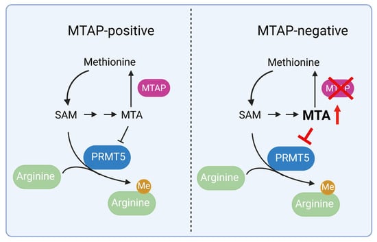 MTAP is an essential enzyme in the methionine salvage pathway [,]. Loss of MTAP leads to the intracellular accumulation of methylthioadenosine (MTA), a metabolite that acts as a natural inhibitor of protein arginine methyltransferase 5 (PRMT5), a key regulator of RNA splicing, transcription, translation, and other vital cellular processes [,] (Figure 1). This biochemical consequence has sparked interest in exploiting MTAP loss as a synthetic lethal target. Specifically, MTAP-deleted cancers show reduced basal PRMT5 activity due to MTA accumulation, creating a unique vulnerability that could be therapeutically targeted [,].
