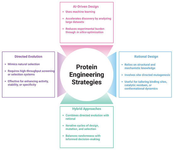 Overview of key strategies in protein engineering. Protein engineering approaches are broadly categorized into Directed Evolution, Rational Design, AI-Driven Design, and Hybrid Approaches. Directed Evolution relies on iterative rounds of mutagenesis and selection, while Rational Design utilizes structural knowledge for targeted modifications. AI-Driven Design leverages machine learning to predict functional variants, and Hybrid Approaches integrate multiple strategies to enhance efficiency and precision in protein optimization. (Illustration created with BioRender.com; https://app.biorender.com, accessed on 25 June 2025.)