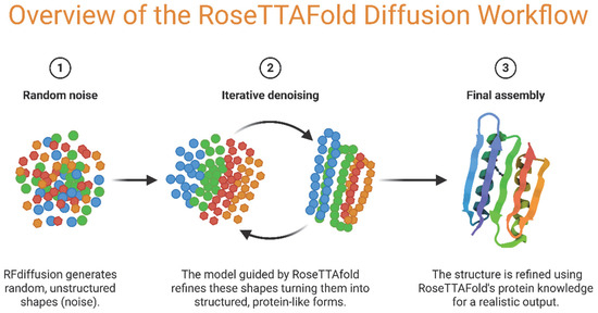 Schematic overview of the RoseTTAFold Diffusion workflow for protein structure generation. (1) The process begins with random noise, where RFDiffusion generates unstructured shapes. (2) Through iterative denoising, the RoseTTAFold model progressively transforms these noisy inputs into structured, protein-like intermediates. (3) The final structure is assembled and refined using RoseTTAFold’s protein structure knowledge, producing realistic protein models. (Illustration created with BioRender.com; https://app.biorender.com, accessed on 25 June 2025.)
