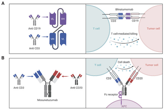 - Wu, J.; Fu, J.; Zhang, M.; Liu, D. Blinatumomab: A bispecific T cell engager (BiTE) antibody against CD19/CD3 for refractory acute lymphoid leukemia. J. Hematol. Oncol. 2015, 8, 104. [Google Scholar] [CrossRef]