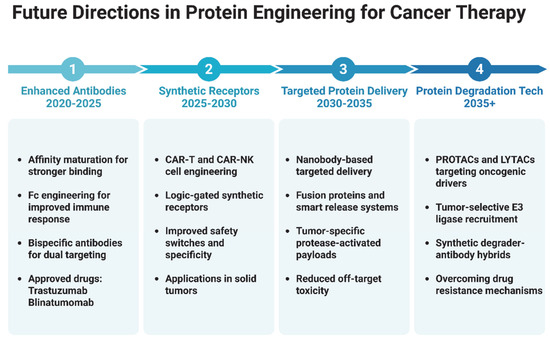 The application of protein engineering in oncology has led to the development of a new generation of cancer biotherapeutics with enhanced efficacy, specificity, and versatility [17]. For example, bispecific T-cell engagers (BiTEs), such as blinatumomab, have demonstrated remarkable success in redirecting the immune system to target and eliminate cancer cells [18]. Similarly, antibody-drug conjugates (ADCs) combine the specificity of monoclonal antibodies with the potency of cytotoxic drugs, offering a powerful tool for targeted cancer therapy [19]. Beyond these established modalities, emerging approaches such as synthetic biology and protein-based vaccines hold promise for further expanding the therapeutic arsenal against cancer [20,21]. Despite these advancements, significant challenges remain in the development and clinical translation of engineered protein therapeutics. Issues such as immunogenicity, protein stability, manufacturing scalability, and tumor resistance continue to hinder the widespread adoption of these therapies [22]. Addressing these challenges will require interdisciplinary collaboration, innovative engineering strategies, and a deeper understanding of the biological mechanisms underlying cancer progression and treatment resistance.