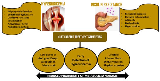 Hyperuricemia management, especially regarding the comorbidity with insulin resistance or type 2 diabetes, calls for an interdisciplinary model of management [77]. This section reviews existing pharmacological treatments, lifestyle modifications, and surveillance approaches that may be used to ameliorate the impact of hyperuricemia in the management of metabolic disorders (Table 1).