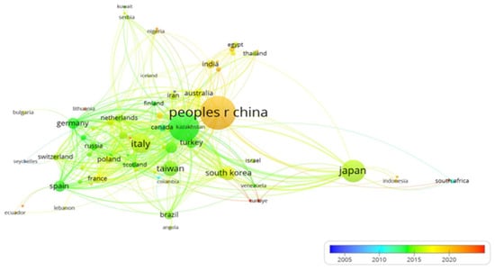 Figure 2 provides insights into how research on hyperuricemia has evolved over the years (2005–2024). From 2012 to 2014, studies primarily focused on the cardiovascular effects of hyperuricemia, with particular attention to hypertension and blood pressure regulation. Between 2015 and 2020, the focus expanded to include insulin resistance, diabetes, obesity, mortality, and metabolic risk factors. More recent research, from 2020 onward, has explored the role of oxidative stress, inflammation, and fatty liver disease, indicating a shift toward understanding the broader systemic effects of hyperuricemia. Countries such as China, the USA, Italy, Japan, Germany, and South Korea have made leading contributions to hyperuricemia studies (Figure 3). These key players and trends in hyperuricemia research suggest limited research on the African population, as only Nigeria and South Africa are faintly represented on the map. Hence, collaboration with studies from such locations with key players may improve knowledge dissemination.
