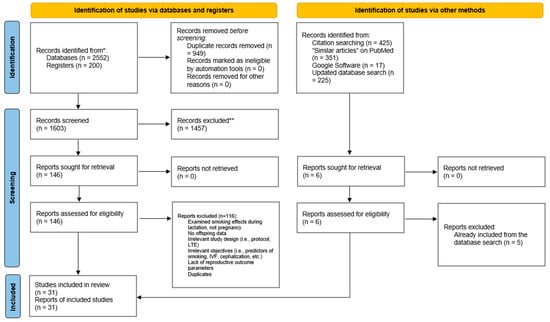 Chicago/Turabian StyleAzizbayli, Yasmin, Amanda Tatler, Victoria James, Adam Watkins, and Lucy C. Fairclough. 2025. "Parental Cigarette Smoke Exposure and Its Impact on Offspring Reproductive Health: A Systematic Review of Maternal, Paternal, and Dual-Smoking Effects" International Journal of Translational Medicine 5, no. 3: 34. https://doi.org/10.3390/ijtm5030034