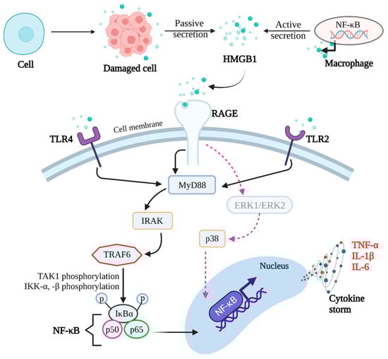 Overall process of HMGB1 release through both active and passive mechanisms, that interacts with receptors such as RAGE, TLR2, and TLR4 to modulate inflammatory responses [].