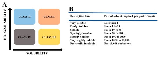 (A) The four categories of biopharmaceutics classification system (BCS); Class I (Tangerine color: high solubility and high permeability), Class II (blue color: low solubility and high permeability), Class III (yellow color: high solubility and low permeability), and Class IV (gray color: low solubility and low permeability); (B) USP and BP solubility criteria of compound.