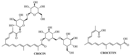 - Lautenschlager, M.; Sendker, J.; Huwel, S.; Galla, H.J.; Brandt, S.; Dufer, M.; Riehemann, K.; Hensel, A. Intestinal formation of trans-crocetin from saffron extract (Crocus sativus L.) and in vitro permeation through intestinal and blood brain barrier. Phytomedicine 2015, 22, 36–44. [Google Scholar] [CrossRef]