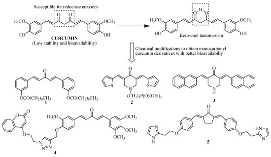 Curcumin is a highly reactive compound because of its unique molecular structure. It is sensitive to visible and UV light, breaking down into a series of compounds with vanillin and ferulic acid being the most prominent end products [,]. Uncontrolled and unknown light exposure has cast a shadow of unreliability on curcumin research to date. Therefore, when studying curcumin, great care must be exercised to avoid exposure to light. Curcumin is unstable in aqueous solutions at pH > 6.5 at 37 °C through an autoxidation reaction, resulting in the formation of cleavage products with the ultimate products becoming vanillin and ferulic acid, cyclopentadione internal cyclization structures, or dimerization compounds [,,,]. Curcumin can also be oxidized by free radicals and oxyradicals, with many decomposition products, accounting for some of the well-known antioxidant properties of curcumin. Curcumin has been found to be metabolized by various aldo-keto reductase enzymes inside the human body that can only capture and degrade its di-ketone group []. To overcome this limitation, mono carbonyl analogs of curcumin have been synthesized by deleting the reactive β-diketone moiety (which was considered to be responsible for the pharmacokinetic limitation of curcumin) (Figure 5) through several chemical modifications in the basic structure of curcumin in order to increase its potential, stability, and bioavailability. Nevertheless, some of the recently developed mono carbonyl curcumin analogs (1–5) (Figure 5) exhibit their improved biological activity [,,,,].