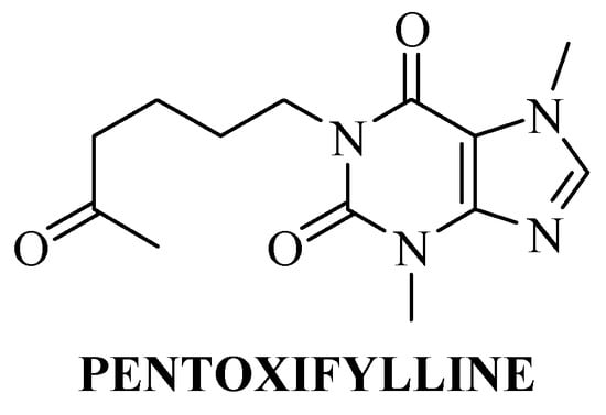 Pentoxifylline (PTX), chemically named 3,7-dimethyl-1-(5-oxohexyl)-3,7-dihydro-1H-purine-2,6-dione or 1-(5-oxohexyl)-3,7-dimethylxanthine, is a BCS (biopharmaceutics classification system) class II drug (Figure 6). It is a methyl-xanthine derivative, and is used as a hemorheologic agent for the therapy of peripheral artery disease. It has been found that this hemorheological agent shows its anti-epileptic effect by affecting the HMGB1/RAGE pathway []. Due to the slow dissolution rate of PTX, the oral administration of the drug has a bioavailability of only 20 to 30%—this needs to be enhanced.