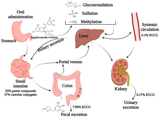 Therefore, the therapeutic potential is limited, due to its poor stability in the gastrointestinal tract and very limited membrane permeability via the intestine [,]. The inconsistency between the in vitro biological activity and in vivo studies can also be recognized to its low stability, which lead to the formation of pro-oxidant molecules and degradative products []. They are unstable under physiological conditions and they usually degrade or metabolize through interactions owing to their hydroxyl groups on the phenol rings []. EGCG generally performs its cellular functioning at relatively high concentrations to affect disease conditions [,]. It is believed that taking green tea polyphenol products in amounts equivalent to the EGCG content in 8–16 cups of green tea daily may mitigate the poor bioavailability of EGCG []. The systemic bioavailability of EGCG increased at higher doses, possibly due to the saturable pre-systemic elimination of oral green tea polyphenols (GTPs) []. However, it is not recommended to use excessive doses of catechins to improve effectiveness. The schematic diagram of metabolism of green tea catechins in EGCG is given in Figure 10 [,,].