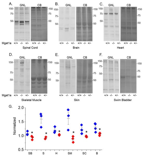 mgat1b−/− in all tested tissues, except brain of the zebrafish lines, and furthermore, different oligomannosylated protein expression patterns could be observed between