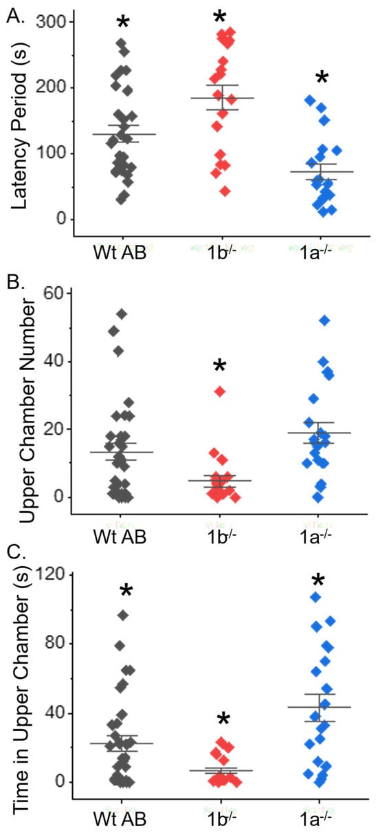 mgat1a−/− fish made their first entrance to the upper chamber in the shortest time and resided in the upper chamber for the longest time, while the