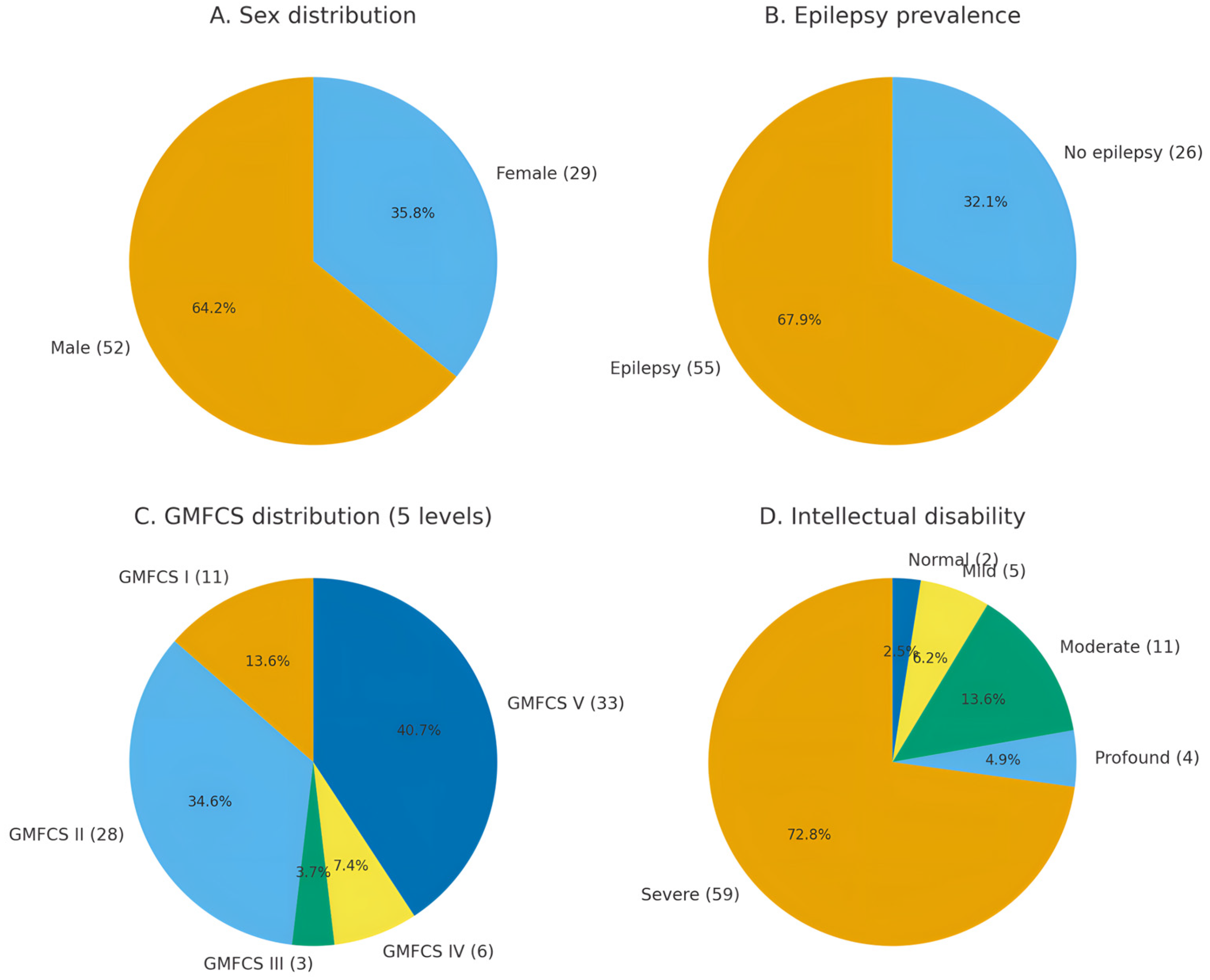 The study included 81 patients with complex neurological phenotypes. Age at the time of evaluation ranged from 6 months to 17 years (median: 6 years; interquartile range: 4–11.5 years).