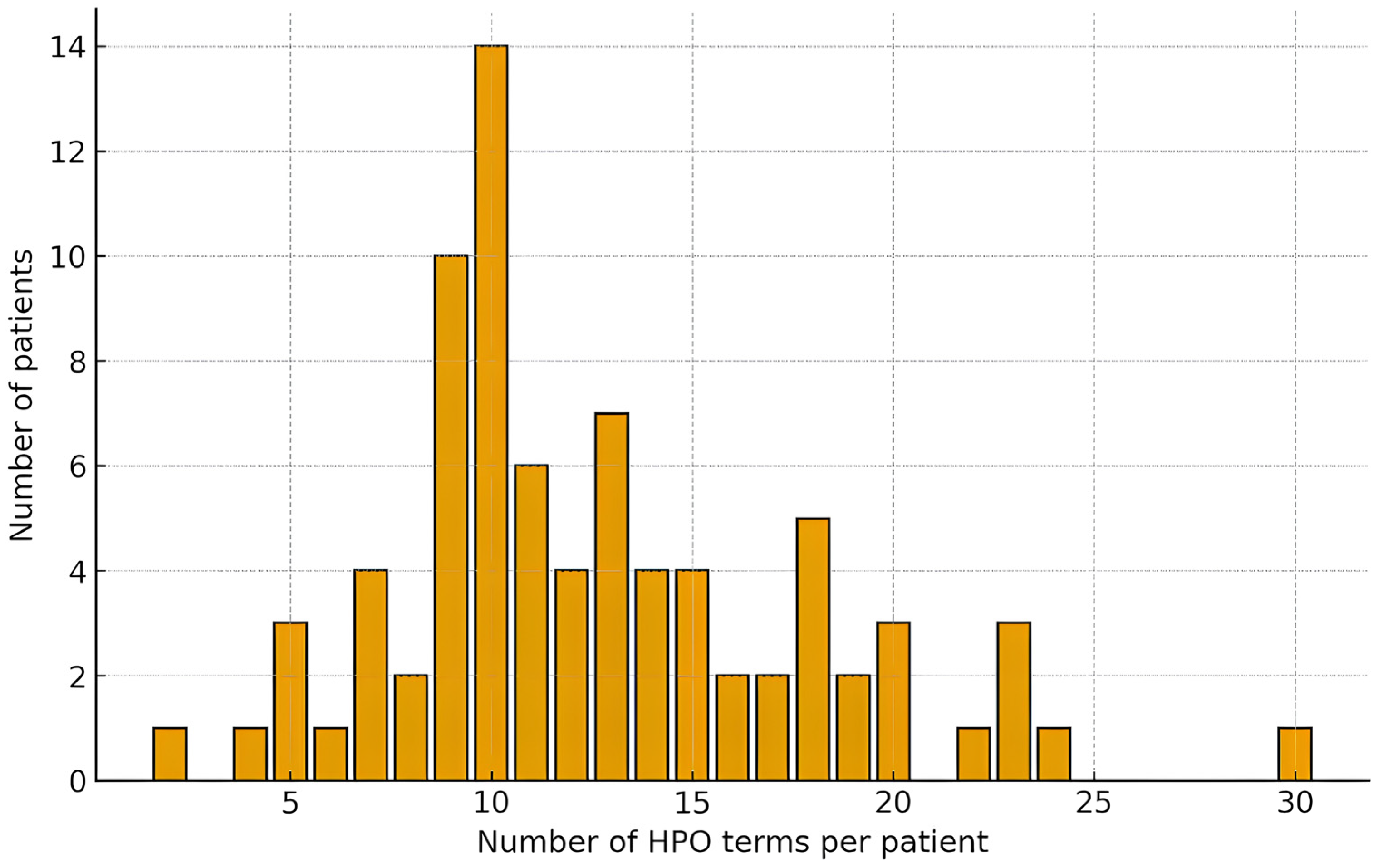 Figure 2 presents the distribution of the number of HPO terms per patient. A detailed clinical characterization of the probands is presented in