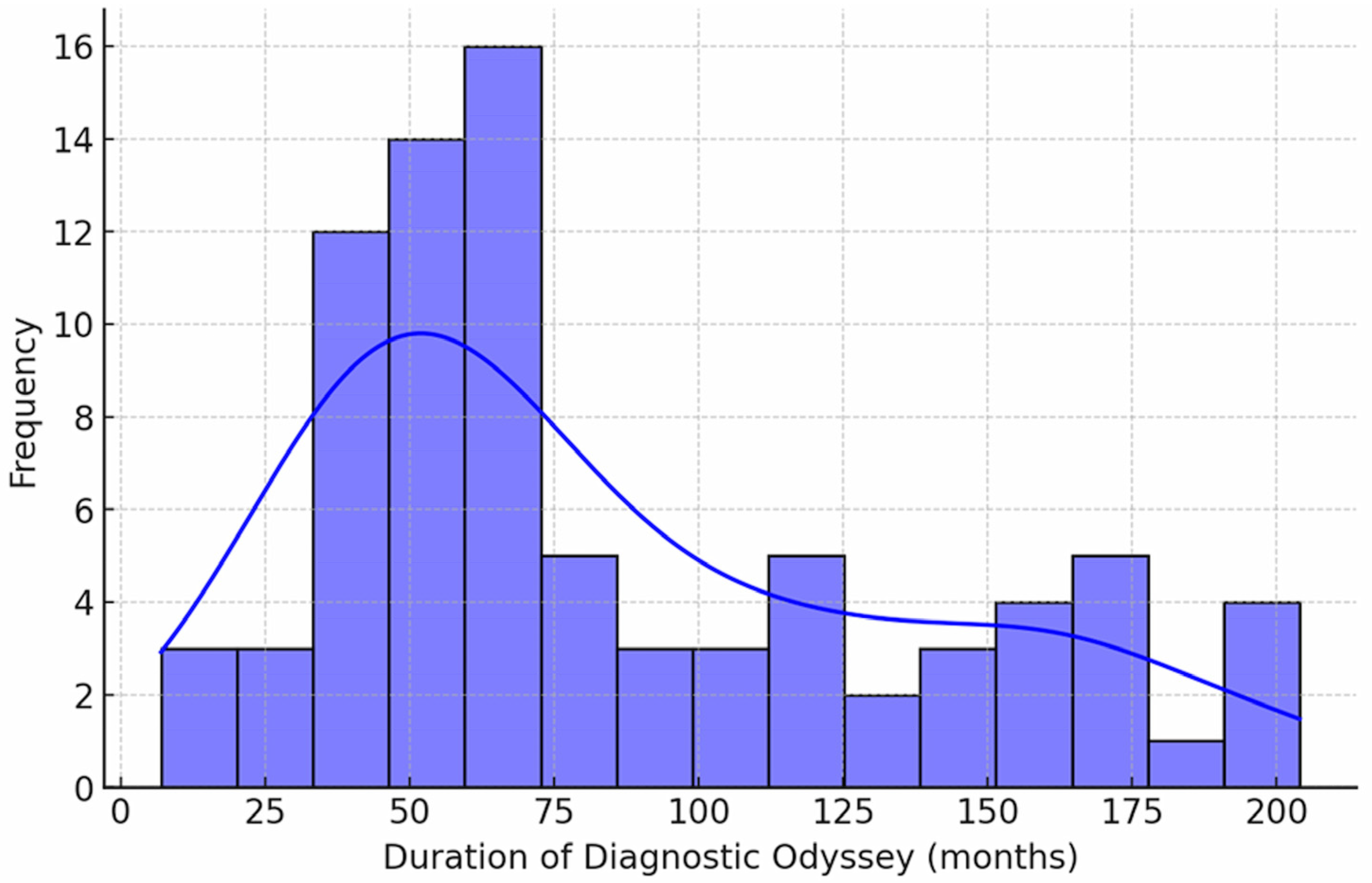 From a healthcare delivery perspective, this integrated diagnostic model resulted in a marked reduction in the diagnostic odyssey. Prior to inclusion, the median duration of the diagnostic process was 72 months, with a median of 20 diagnostic procedures per patient. Following the implementation of our protocol, diagnoses were achieved within 4–5 months and required only two confirmatory investigations. Although we stated that the median number of pre-study diagnostic tests was approximately 20, this figure represents an average across a clinically heterogeneous cohort. As shown in