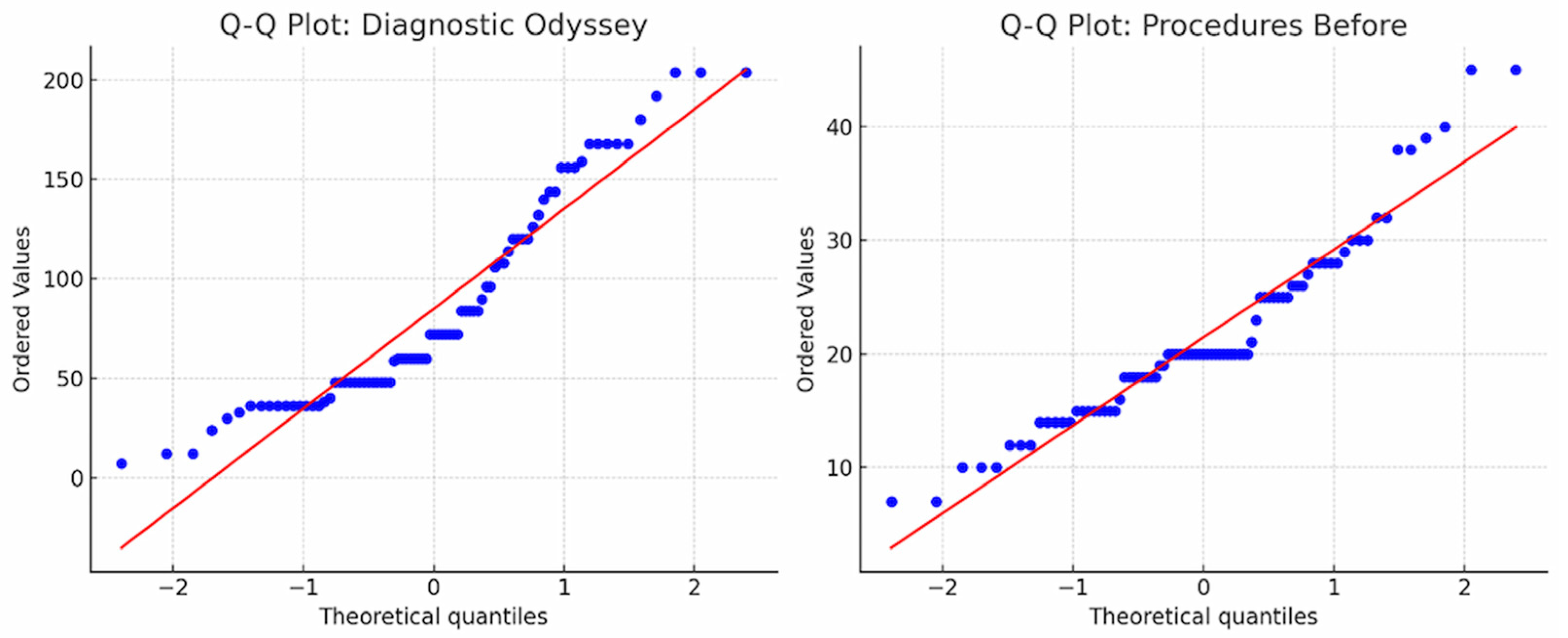 To assess the significance of differences in the duration of the diagnostic process before and after inclusion in the study, statistical data analysis was performed. The Shapiro–Wilk test revealed a deviation from normal distribution (p < 0.05) in both groups, which justified the use of a non-parametric comparison method. The Wilcoxon signed-rank test for paired samples was applied to assess statistical differences.