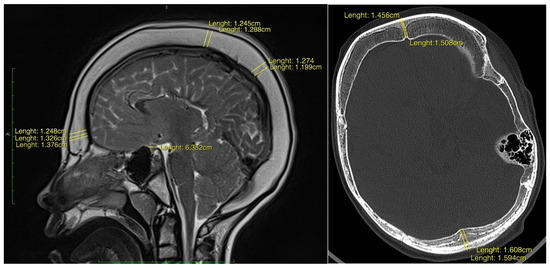 Data collection was performed by qualified clinicians. Acquisitied variables included patient demographics, age at initial shunt implantation, type of shunt system used (VP or VA), history and number of shunt revisions, presence of external ventricular drainage (EVD) or Rickham reservoir placement, latency period between shunt surgery and radiological detection of hyperostosis, incidence of central nervous system (CNS) infections, and age at diagnosis of overdrainage syndrome and cranial hyperostosis. Radiological data were reviewed retrospectively, and morphometric assessments were conducted on the most recent cross-sectional neuroimaging studies (CT or MRI) available. Cranial CT examinations were acquired on a 64-slice multidetector scanner using paediatric protocols with automatic dose modulation, 100–120 kV, and thin-slice reconstruction (0.75–1 mm, increment 0.5 mm) in both bone and soft-tissue kernels. MRI examinations were performed on 1.5 Tesla device with dedicated paediatric head coils, applying standard paediatric brain protocols consistent with paediatric neuroradiology guidelines. Typical acquisition included T1-, T2-, and FLAIR sequences in multiple planes, diffusion-weighted imaging, and susceptibility-sensitive sequences, with slice thickness 3–5 mm and field of view 200–240 mm. Intravenous contrast was administered when clinically indicated: iodinated contrast for CT (1.5–2 mL/kg) and gadolinium-based contrast for MRI (0.1 mmol/kg). Calvarial bone thickness was measured in the axial and coronal planes at three predefined anatomical landmarks: the glabella (frontal bone), the vertex (parietal bone), and the lambda (occipital-parietal suture). The maximum value at each site was recorded, and values were compared against paediatric normative data from the literature [13].