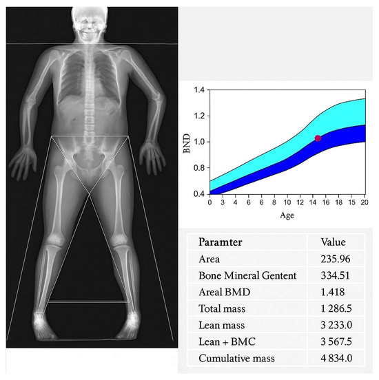 Quantitative DXA analysis of the cranial vault ROI was performed (Table 5, Figure 2). The mean projected area was 213.75 ± 16.73 cm2 (195.59–235.96 cm2). Bone mineral content (BMC) demonstrated a mean of 345.45 ± 46.83 g (294.35–407.45 g), whilst areal bone mineral density (aBMD) averaged 1.635 ± 0.32 g/cm2 (1.404–2.083 g/cm2), consistent with established paediatric reference standards. Within the defined ROI, total mass (comprising osseous and soft tissue components) was 1 079.67 ± 154.09 g (916.7–1 286.5 g). Lean soft tissue mass alone measured 2 717.40 ± 393.49 g (2 278.3–3 233 g), and the aggregate metric of lean mass plus BMC was 3 062.83 ± 371.09 g (2 685.8–3 567.5 g). Coefficients of variation for BMC and aBMD were below 1.5%, attesting to the robustness of ROI de-lineation and instrument stability.