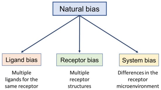 Bias exists inside the human body and is known as natural (or physiological) bias. Natural bias can be divided into endogenous ligand bias, receptor bias, and biological system bias (Figure 2). Receptor and system biases are discussed in Section 3.3 and Section 3.4, respectively. Natural ligand bias is observed for receptors with multiple ligands, contributing to fine-tuned signaling that ultimately regulates physiological cell responses and the homeostasis of one’s own organism [69]. Prevalent examples of natural ligand bias are mentioned below.