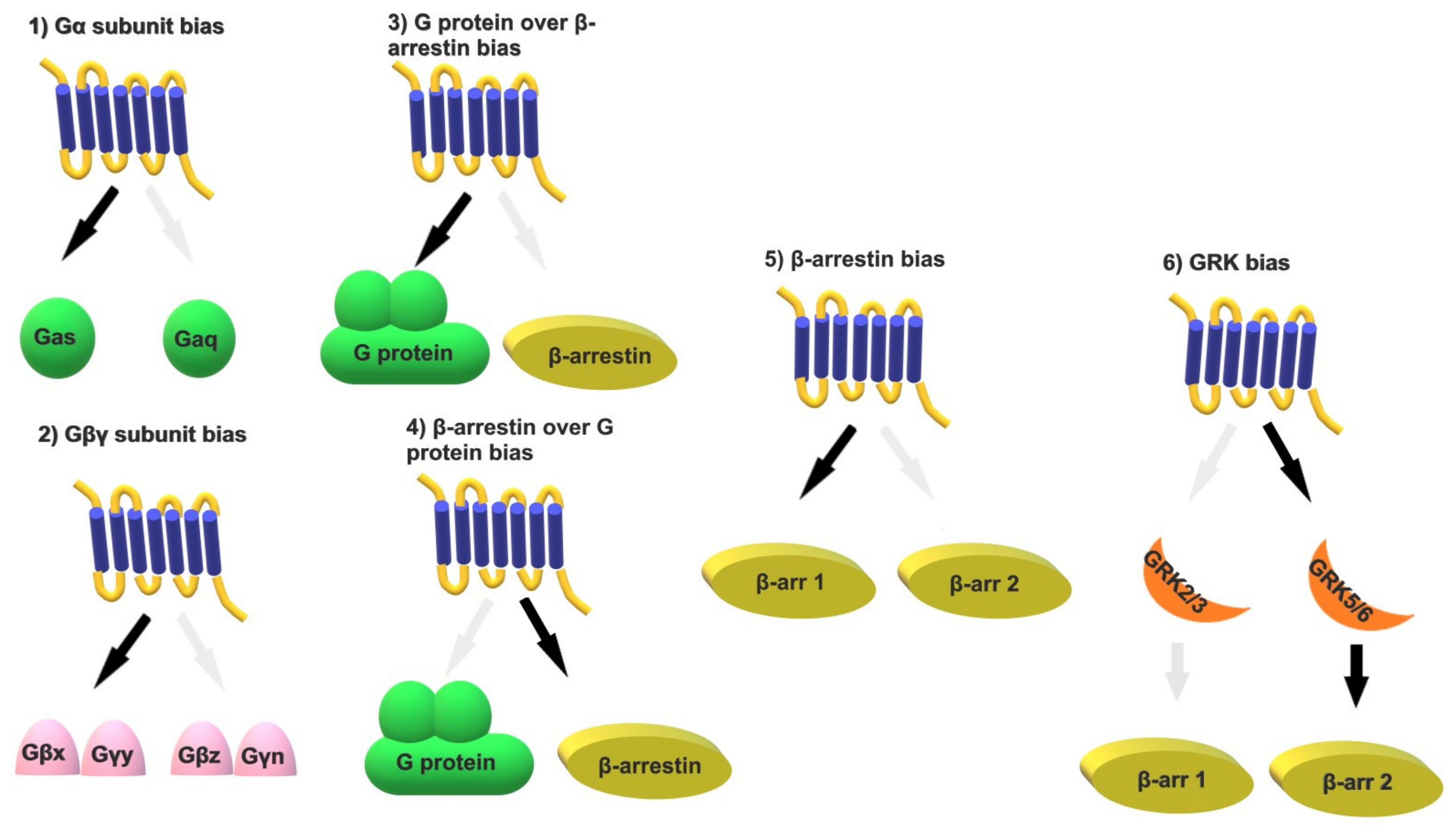 - β-arrestin over G protein bias: The conformational patterns of the complex between the ligand, the receptor, and the β-arrestin dictate the effectors to which arrestin will bind and how it will regulate G protein signaling [62]. Examples are discussed in the following sections.