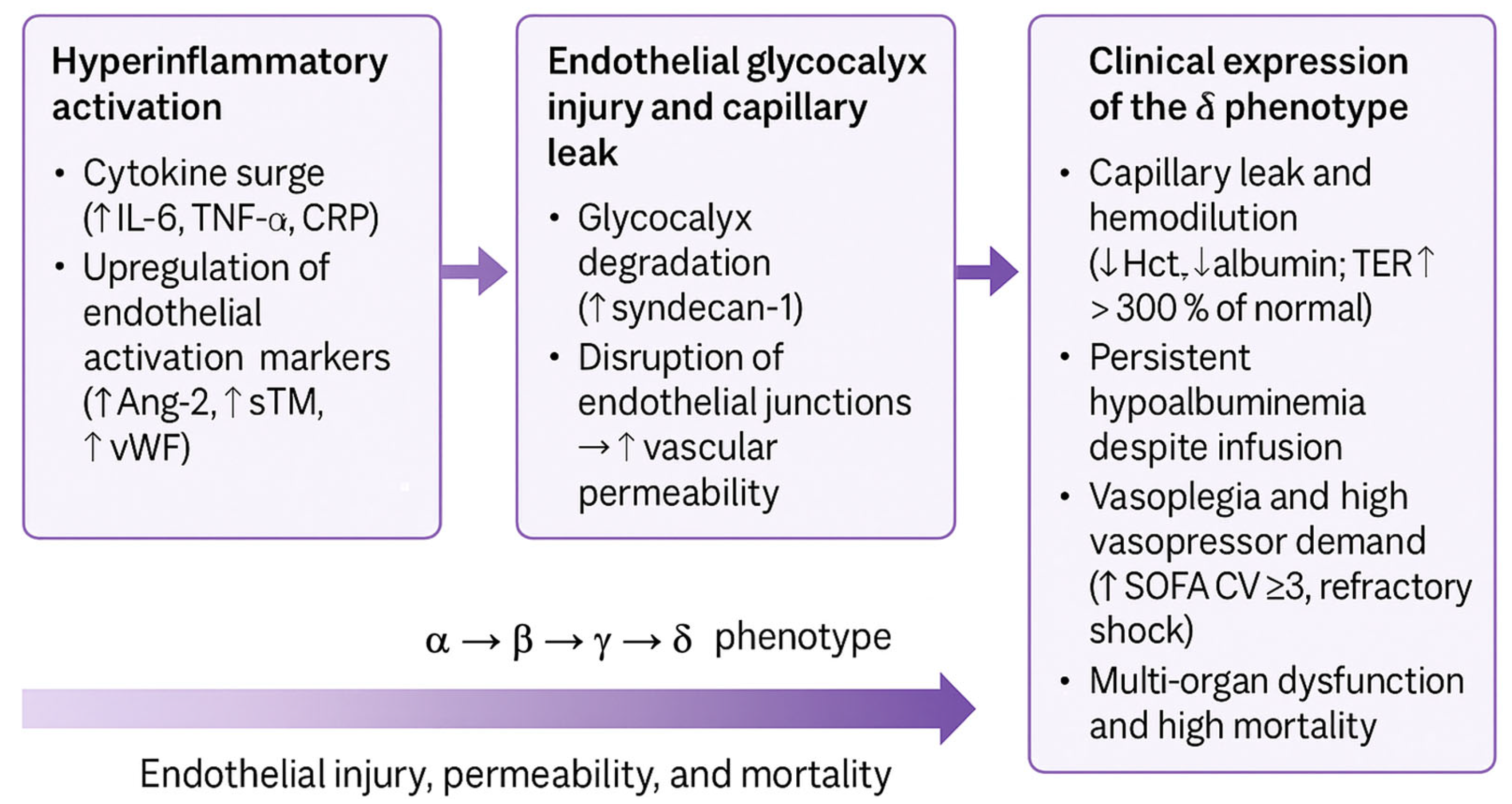 - Clinical expression of the δ phenotype: Hemodilution (decrease in Hct) and albumin (TER > 300% of normal), persistent hypoalbuminemia despite infusion, vasoplegia (SOFA-CV ≥ 3), and multiorgan dysfunction.
