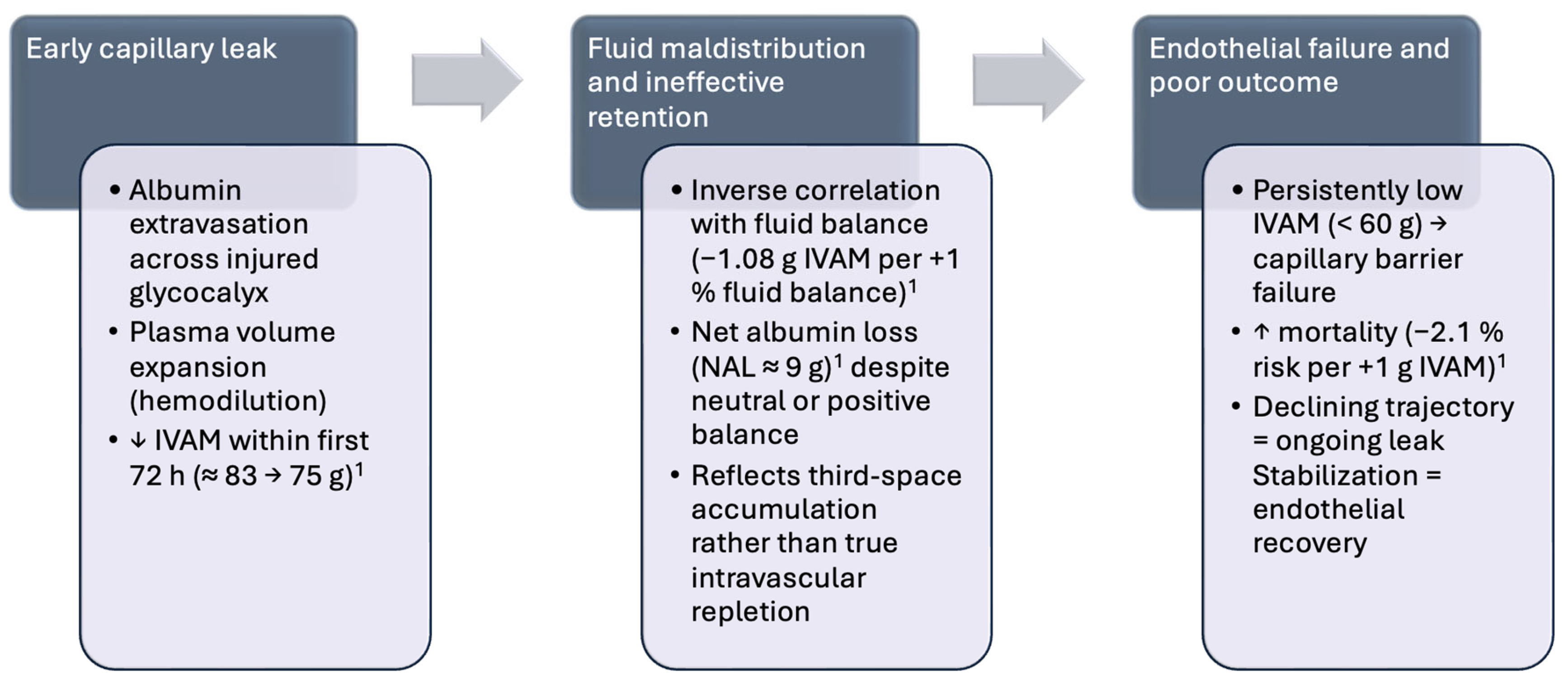 | ↑ Albumin + ↑ IVAM | Endothelial repair and improved retention | Window for targeted albumin therapy to restore oncotic pressure and support refilling. |