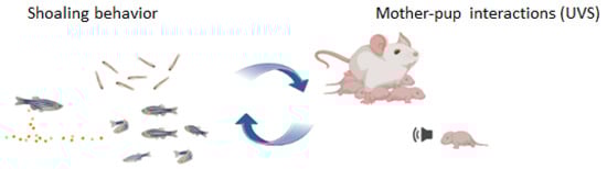 When directly comparing small rodents to cichlids, not considering the lower costs of breeding and maintenance and the genetic manipulation of a large number of subjects in fish, early offspring–mother bonding with active and proactive behaviors in both species acts to meet offspring needs and the reciprocal tuning of survival strategies through typical behavioral patterns and dyadic vocalizations. In particular, the acoustic communication exploited by cichlids when parenting [95] represents a valid similarity with extensively used USVs to communicate between mother and offsprings [96], behavioral features largely investigated in animal models of ASD [97]. Moreover, some cichlids species (Discus fish, Symphysodon spp., [98]) provide direct nourishment to fries through skin mucus, somehow resembling the availability of milk produced by mammals.