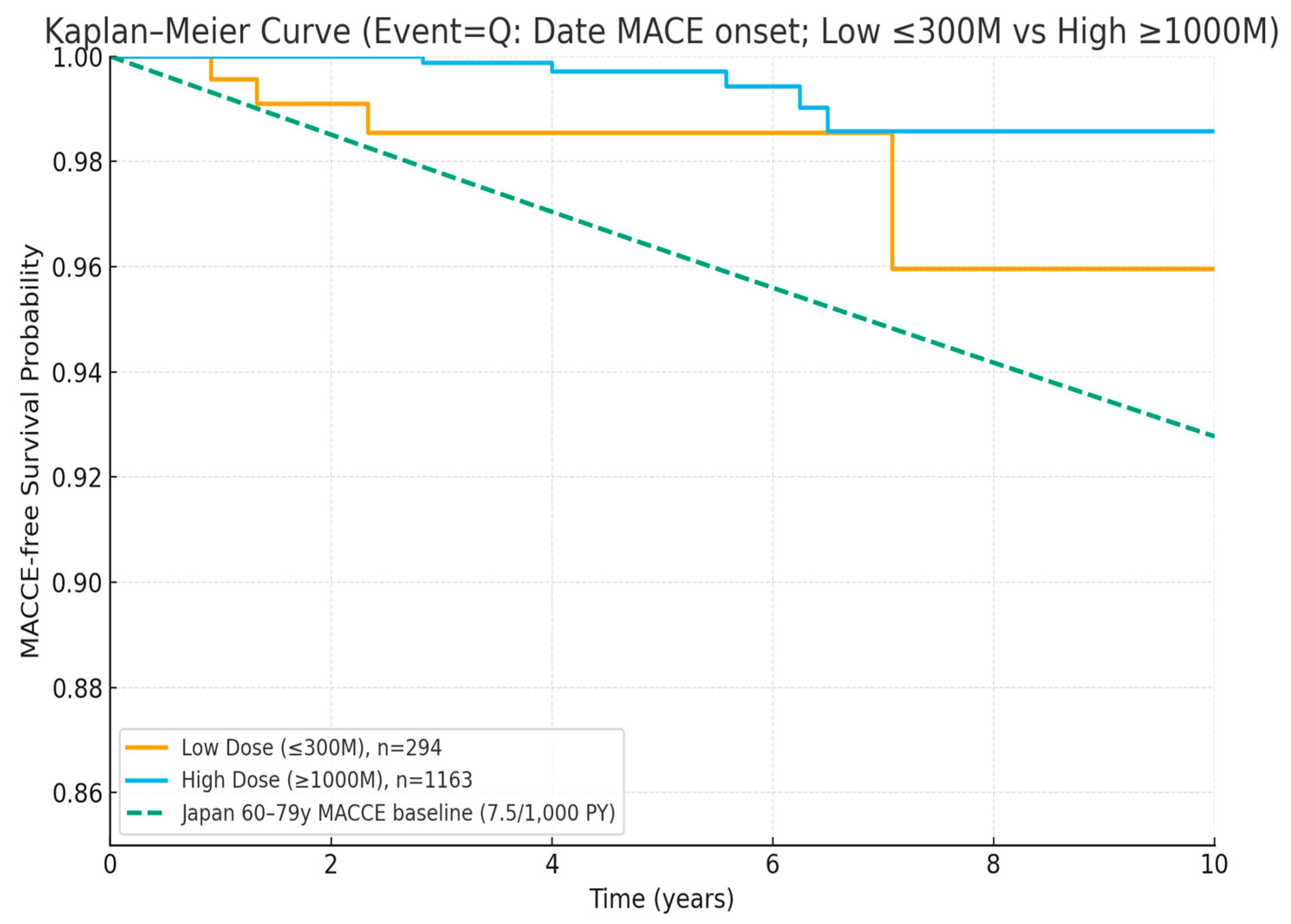 Figure 2 shows the Kaplan–Meier survival curves for MACCE-free survival comparing the high-dose (≥1 × 10
