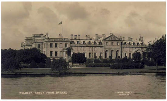 Welbeck is about 10 km away from Worksop, and as we approach it, its enormous extent and beauty dawns on us. The architecture is a mixture of styles constructed during different periods, classic and Italian, with an imprint underneath that has been devoid. Welbeck Estate occupies about 60,000 square meters of land and extends to the boundaries of Nottinghamshire and Derbyshire (Figure 6). It is the most prosperous territory of all Dukeries, a district consisting of four ducal properties: Clumber House, of the Dukes of Newcastle; Thoresby, belonging to the Dukes of Kingston; Worksop Manor, belonging to the Dukes of Norfolk; and finally, Welbeck Abbey, home to the Dukes of Portland.