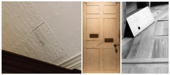 The curious room that he used during the day shows his wit. It was equipped with a trapdoor on the floor, by which he could descend underground to wander through the tunnels without anyone noticing his absence (Figure 4). The trapdoor had incorporated a reversible opening and closing system, which meant he could walk unnoticed beneath his estate and reappear in the abbey as mysteriously as he had left it (A clear introduction of the Bentinck’s family and 5th Duke of Portland as a figure of extravagance, with an interesting life-timeline and family tree. The text describes an ingenious room that he used during the day, from which he descended underground to wander through the tunnels without anyone noticing his absence, in ARCHARD, C (1907): The Portland Peerage Romance, p. 62, Greening London Ed.). In addition, the room also had another door leading to the anteroom; it was this that served as a communication link to his service. He wrote the orders that had to be carried out on two small mailboxes on the door. The duke wrote down what he needed on paper and deposited it in the mailbox, which opened from the anteroom. Then, a bell rang, to signal that a certain order should be executed.