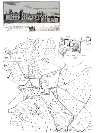 Welbeck Estate, 1629. Two centuries before the duke’s appointment. Literal inscription at the top of the plan: “The Abbey and Gardens, after W. Senior, 1629”. The buildings are those that make up the abbey. The upper drawing is by Samuel Buck, 1726. On the left, the West Wing which would become the duke’s Oxford Wing after the extension and on the right, the old chapel. (Archives Manuscripts and Special Collections. University of Nottingham, Nottingham, UK).