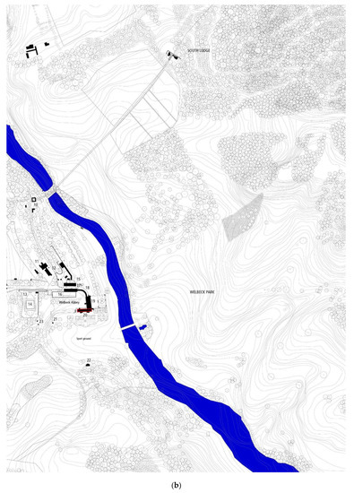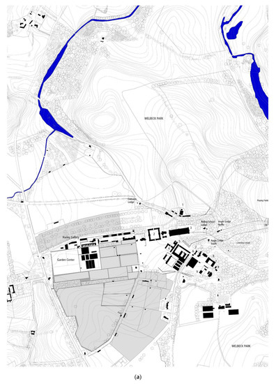 (a) Welbeck Estate, 2015. Scale 1:8000. Cartography drawn by the author based on the documentation provided by the British Cartographic Society, 2015. 1. Elephant Hut. Garages and offices_ 2. Future School of Architecture (old stables)_ 3. Editorial Funds (former Riding School)_ 4. Bursars Court_ 5. Strangers Yard_ 6. Wood Yard Lodge n° 1_ 7. Old School_ 8. Lower Motor Yard_ 9. College Workshop. (b) Welbeck Estate, 2015. Scale 1:8000. Cartography drawn by the author based on the documentation provided by the British Cartographic Society, 2015. 10. Shrubbery Lodge_ 11. New Kitchen Lodge_ 12. New Science Block_ 13. Rose Corridor_ 14. Sunken Garden_ 15. Old Kitchen Block_ 16. Ballroom_ 17. Library and Chapel_ 18. The Virgin’s Block_ 19. Old Wing_ 20. Oxford Wing_ 21. Summer House_ 22. Cricket Pavilion_ 23. Nissen Hut_ 24. Gate Lodges.