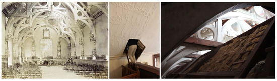 Titchfield Library, 1896. (left) The old Riding Hall was converted into a library and chapel by the 5th Duke of Portland (Manuscripts and Special Collections, University of Nottingham, Nottingham). (center) Hatch into the false ceiling. In the images taken during the author’s visit in October 2015, the wooden beams have disappeared. (right) A new roof, carved with natural and divine images, hovers over our heads, molding space with a new shape.