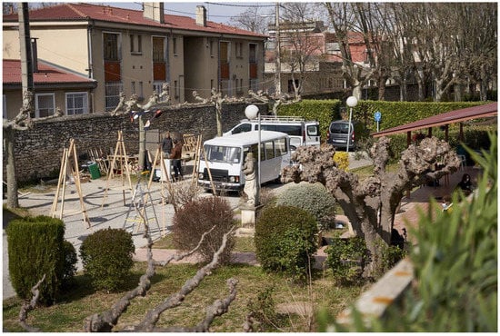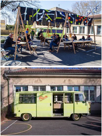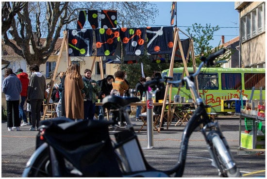 The ephemeral durability of the design projects is an essential factor in experimental practices. Anne-Marie Lecoq, when talking about ephemeral architecture, points out two elements to the analysis of the effects of this factor. On one hand, it lies in “the absence of imperatives of robustness, hence the choice of perishable materials and specific construction techniques” [] (p. 437). By using materials and techniques of simple construction, this first aspect allows practitioners to share their expertise with the people on the construction sites, from a participatory perspective. The structures of the mobile third place are, for example, made of wooden cleats. On the other hand, and paradoxically so, Lecoq claims that ephemeral architecture is the “opposition to the temporary”, because it is not “a makeshift solution while waiting for something else, it is a structure that exists for itself, until something happens” [] (p. 437).