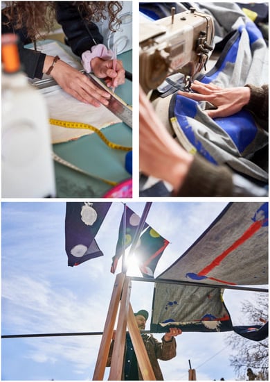 The participatory construction site is conceived as a combination of building workshops for the structure (poles, external venetian, etc.) and the furniture (Figure 3), but also workshops for sewing (Figure 4), painting, graphic designing, in order to decompartmentalise skills and design the work collectively. The equipment proposed by the architects is simple and easy to use: saws, screw drivers, non-professional sewing machines, paint brushes, etc. Those experimental practices have as a core idea that the practitioner must master the tools and being able to pass on how to use them.