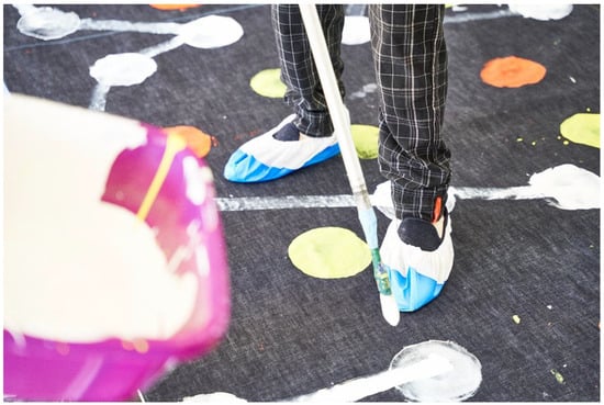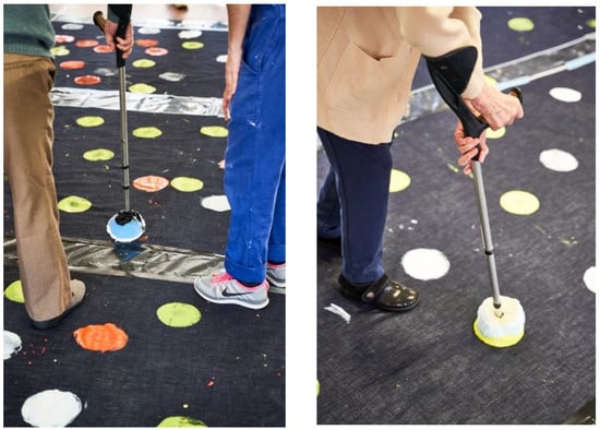 Alongside those workshops, the artist Bonnefrite organises some “bals-peinture”, paint dances (Figure 5). The idea is to invite the residents wishing to do so to contribute to the graphic design of the denim canvases that will be used in all the textile elements of the project, and by doing so during a convivial gathering. In order to create paint tools that are adapted to the residents’ motor skills, we create them together, using simple and inexpensive means, by recycling former medical devices that had been discarded. In that instance as well, auto-construction and handiwork generate a collective imaginary referencing the willingness to hijack the traditional logic of production of artworks. The practice of self-construction lies in the fact of composing with the existing, by arranging with fresh eyes the shapes, know-how, available materials to foster the appropriation of works and their co-productions.