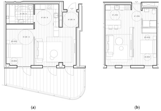The conditions of accessibility are based on the bases established in Decree 68/2000 of 11 April [39], which approves the technical standards on accessibility conditions for urban environments, public spaces, buildings, and information and communication systems, and the Technical Building Code Basic Document SUA [40]. In addition, in developments of housing units, the number of housing units adapted for people with reduced mobility will be one for every 25 units or fraction thereof. This type of unit shall have a minimum programme of two rooms.