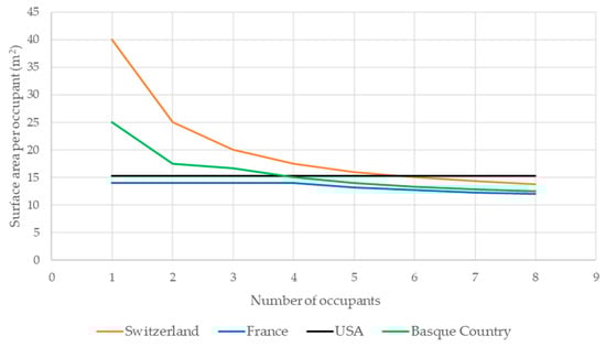 Families, or rather cohabitation units, have experienced a radical reduction, which can be observed at European, national, and regional level. The average for European Union [16] Member States is 2.3 persons per dwelling. France and Switzerland have average values of 2.1 and 2.2, respectively [16]. In Spain in 1991, the average size was 3.28 occupants per dwelling, while in 2011 this figure was reduced to 2.50 persons per household as a national average [17]. According to the latest census carried out by the INE, the Autonomous Community of the Basque Country currently stands at 2.44 inhabitants per household, a value below the national average, along with the Principality of Asturias and the region of Castile and Leon, with figures of 2.34 and 2.42, respectively [17].