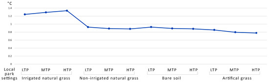 Overall, the various park settings positively reduced the urban heat intensity, while the ground cover type and the absence of irrigation altered the reduction values (Figure 2). The average temperature reduction among the various park settings ranged between 0.78 °C and 1.34 °C. The average reduction based on the ground covers during the simulated 25 h was highest for the local parks with irrigated grass and high tree proximity, leading to an overall decrease of 1.34 °C, followed by an identical reduction of 0.93 °C for parks with dry grass and bare soil with low tree proximity, and lastly a reduction of 0.85 °C for parks with artificial grass and low tree proximity. The same park settings variables also worked to reduce the peak temperature of the day; the reduction ranged between 3.6 °C and 2 °C.