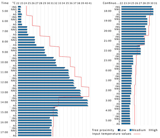 Generally, the various park settings positively offset the increased air temperature during the day. However, the offset was delayed or negated when associated with a drop in the input air temperature (Figure 3). The reduction remained positive up to 1 p.m., when the air temperature was at its maximum for the day. The park temperature continued to increase up until 2 p.m., even though the input temperature was reduced by 8 °C (due to a high increase in wind speed and the formation of clouds in the sky), which resulted in an almost one-hour delay and a higher temperature of between 6.2 °C and 7.8 °C for the various local park settings. The same phenomenon was noticed at 3 p.m., 6 p.m., and 10 p.m., where the input temperature was less than the simulated temperature at the parks.